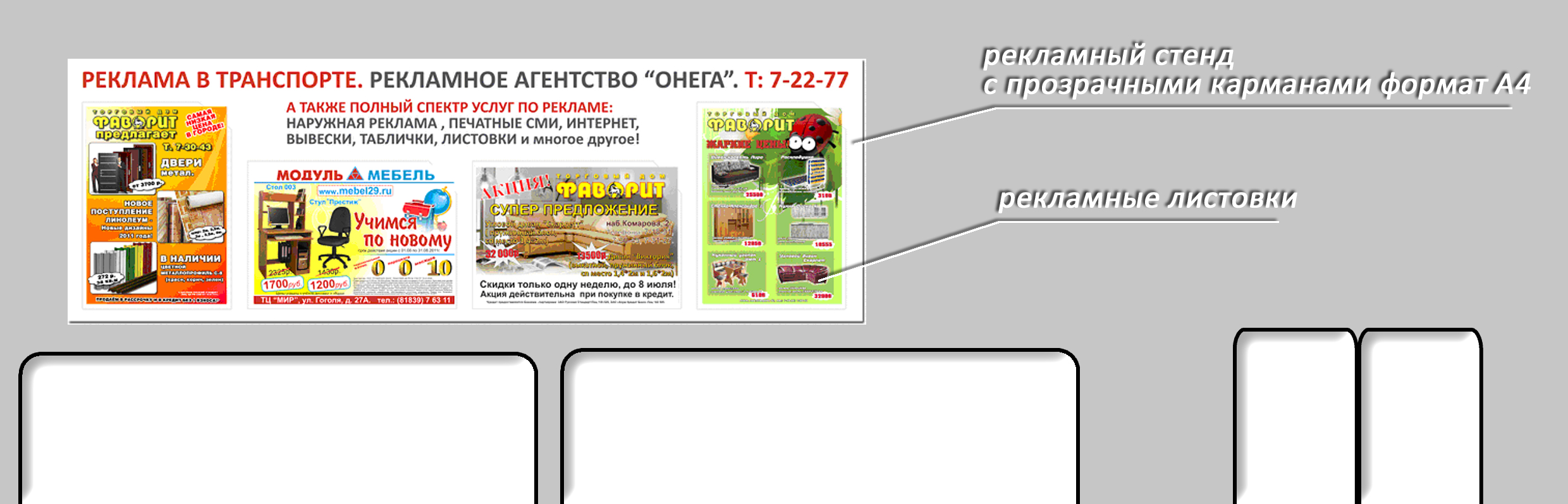 - размещение в 17 автобусах листовок формата А4 в карманах на рекламном стенде на 4 недели на всех городских и пригородных в маршрутах - 4500 руб.+ изготовление - 340руб.